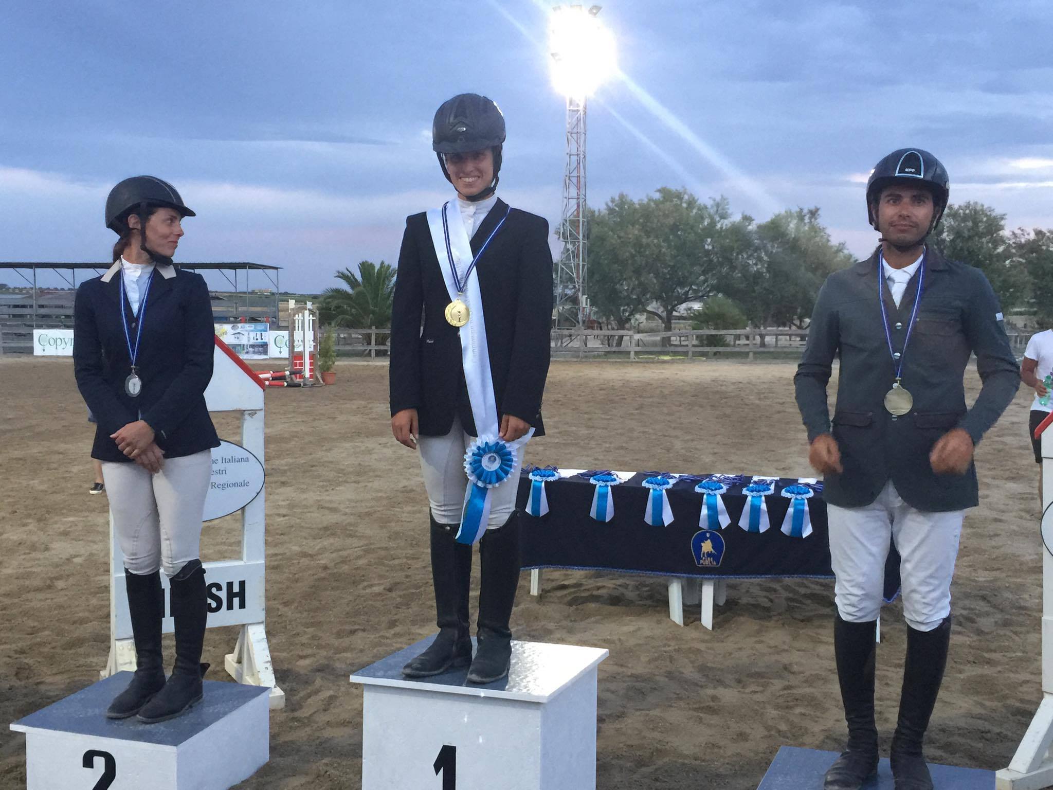 che ha confermato l’Oro dell’anno precedente in sella ad Hengs, che piazza sua volta l’allievo Attilio Lattanzi, che segue lei personalmente come istruttore base del Circolo, in sella a Real a cui va l’Oro per il Trofeo Promesse Cavalli; Veronica Luccarelli, per il I° Grado Junior in sella a Sibelle Des Merles, già medaglia d’argento ai Campionati Centro Meridionali di Atina del 2015, del Circolo Ippico “Giuliana” a cui è andato sempre l’Oro nel I° Grado Junior, seguita come istruttrice da Alessia Lucchese che tra l’altro piazza nelle prime posizioni anche altri suoi allievi, la bella Marta Ipser in sella ad Urola, che pur partecipando per la prima volta ad una gara ufficiale, conquista l’Argento nella categoria Trofeo Brevetti con un bel percorso pulito, la piccola Martina Amodeo per la Brevetti Pony a cui è andato il Bronzo. E sulla stessa scia Oro per i Brevetti Esordienti a Ginevra Maria Prete che con Typhdon seguita da Francesco Lenti del Ghibli di Grottaglie , sempre in provincia di Taranto.